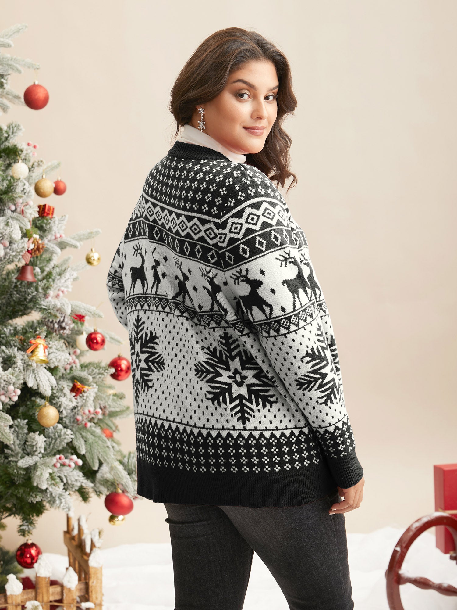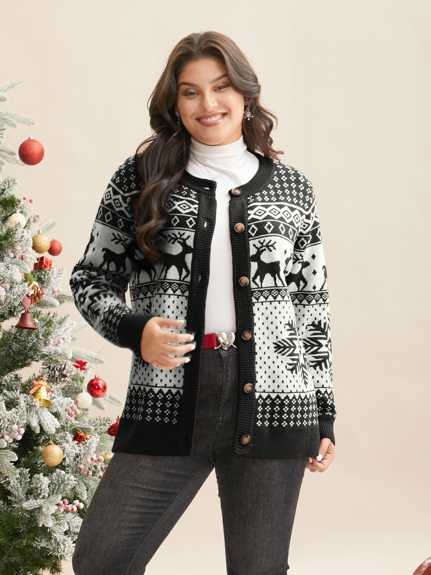 Shop Reindeer And Snow Pattern Button-Front Cardigan now and redefine your style with confidence at Sweetccc. Tailored for mid and plus-size women. This trendy Sweaters Cardigans Women. sizes 10-30. Color:Scarlet.Black;Style:Casual;Neckline:Round Neck;Sleeve Type:Drop shoulder sleeve;Pattern Type:Christmas;Prints:Geometric & color block;Details:Button;Pocket:No-pocket;Belt:No-belt;Closure Type:Open front with closure