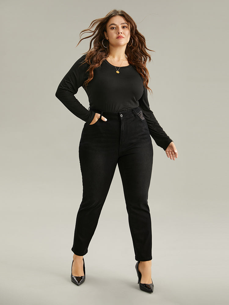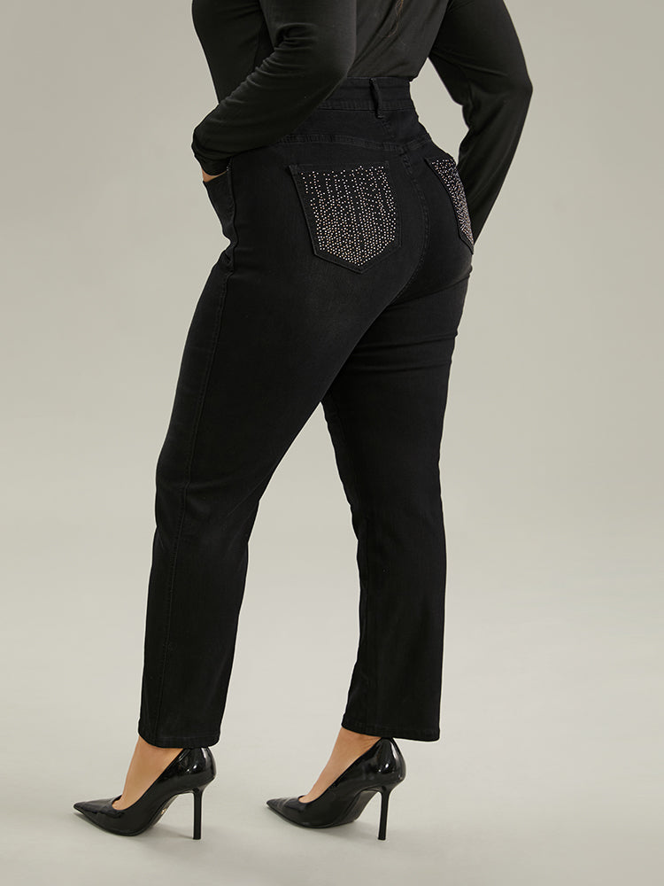 Shop Rhinestone Detail Straight Leg Black Wash Jeans now and redefine your style with confidence at Sweetccc. Tailored for mid and plus-size women. This trendy Denim Women. sizes 10-30. Season:Winter;Color:DimGray;Style:Casual;Pattern Type:Plain;Details:Pocket. Button. Zipper. Plain. Rhinestone detailing;Pocket:It is perfectly sized to carry a phone.;Belt:No-belt;Closure Type:Zipper;Wash:Black Wash