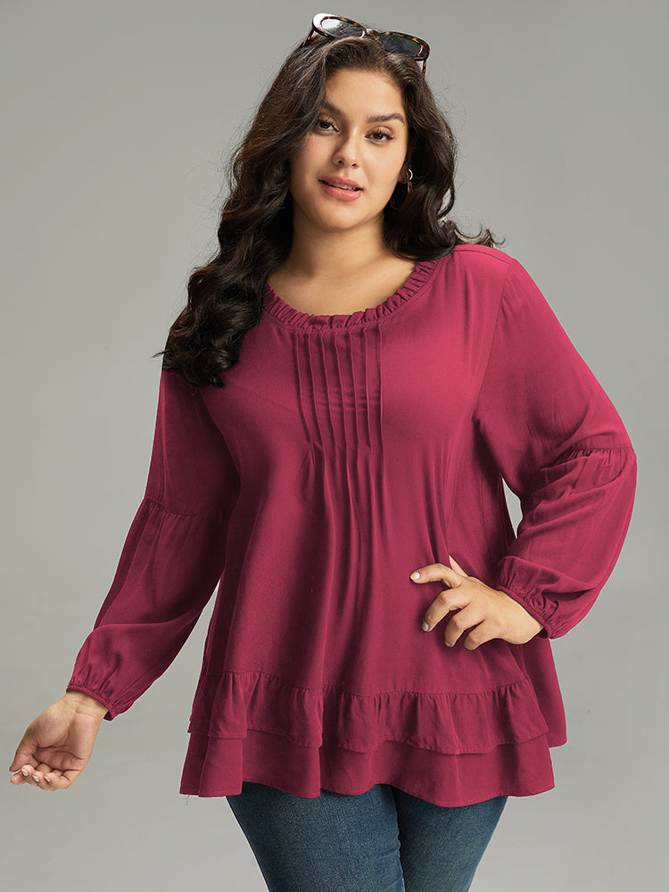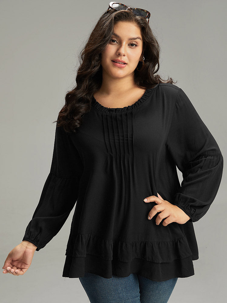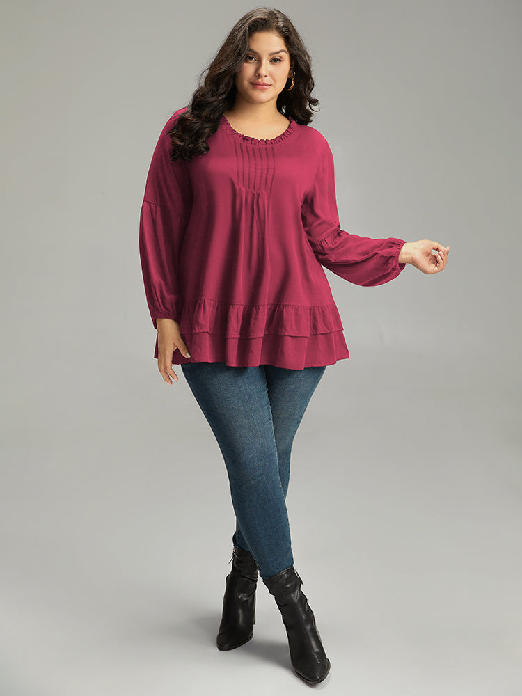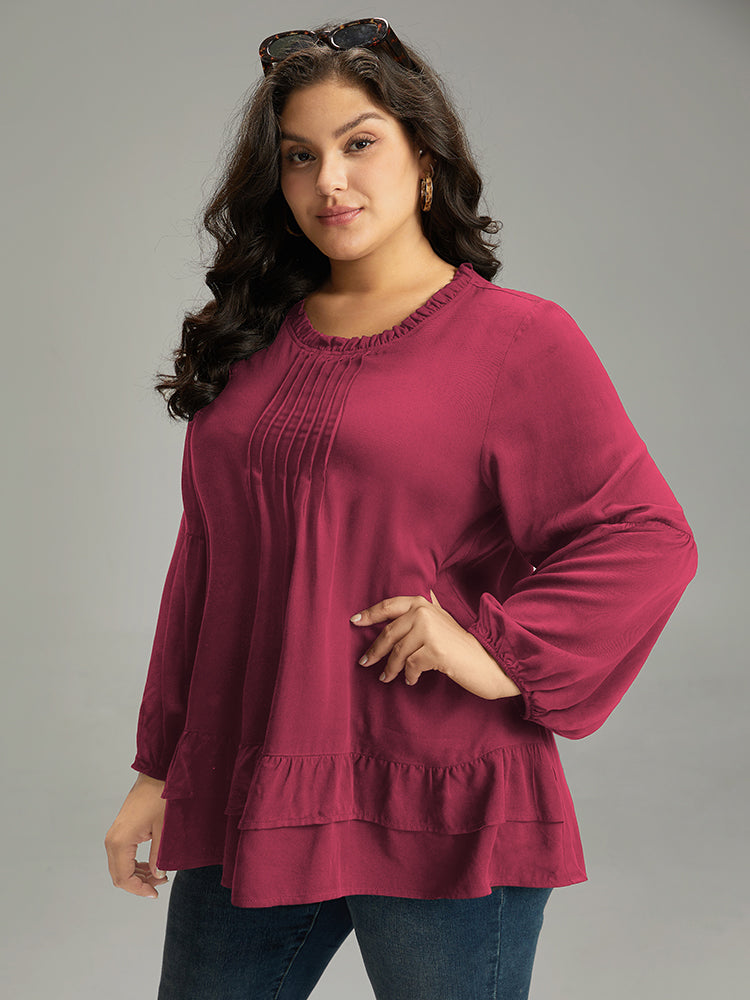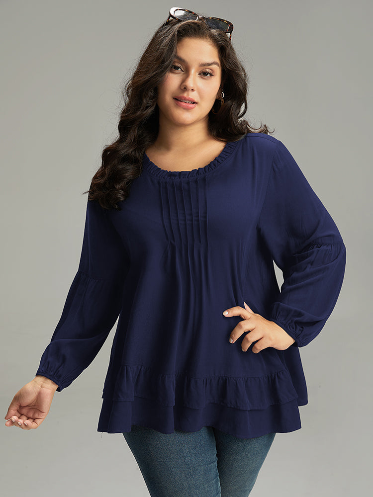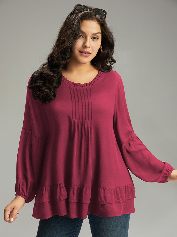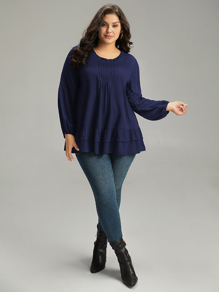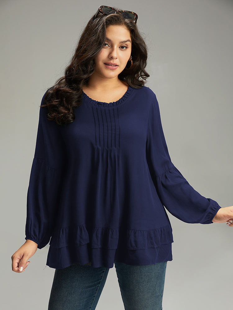 Shop Seam Detail Frill Trim Layered Blouse now and redefine your style with confidence at Sweetccc. Tailored for mid and plus-size women. This trendy Tops Women. sizes 10-30. Color:Indigo.Scarlet.OrangeRed.Black;Style:Elegant;Pattern Type:Plain;Neckline:Round Neck;Sleeve Type:Lantern Sleeve;Details:Ruffles. Pleated. Plain. Elastic cuffs. Tiered;Pocket:No-pocket