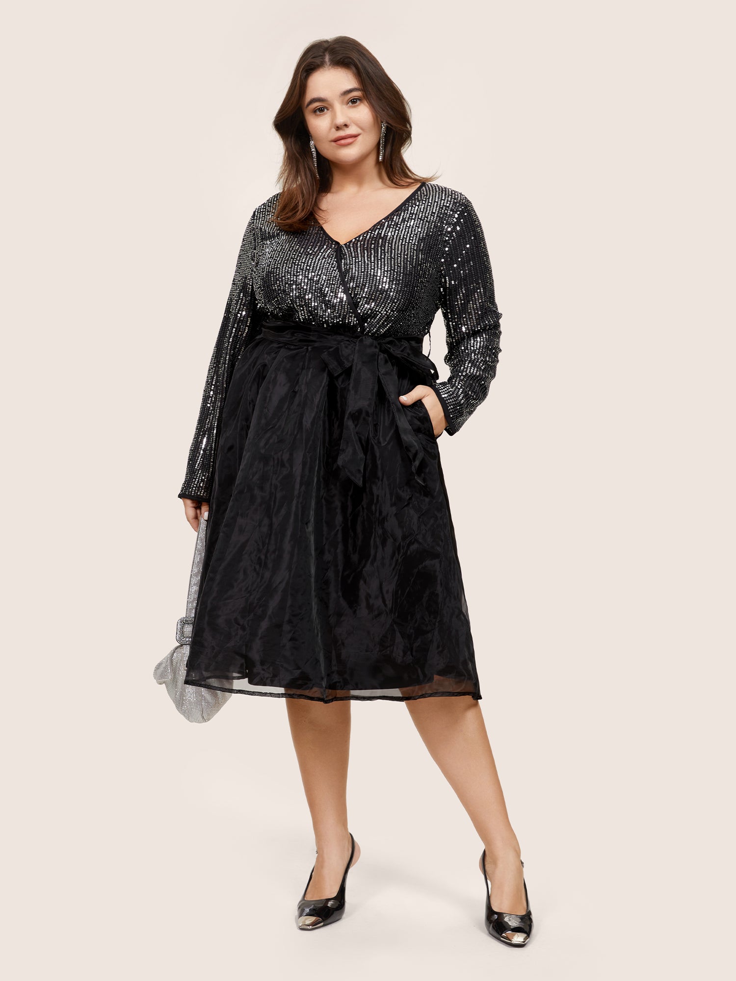 Shop Sequin Mesh Patchwork Wrap Belted Dress now and redefine your style with confidence at Sweetccc. Tailored for mid and plus-size women. This trendy Dress. sizes 10-30. You can never go wrong with Sweetccc Dresses. Season:Winter;Color:Black;Neckline:Overlap Collar;Sleeve Type:Regular Sleeve;Pattern Type:Plain;Details:Pocket. Button. Elastic Waist. Patchwork. Wrap. Sequin. Belted;Pocket:It is perfectly sized to carry a phone.;Belt:Belt