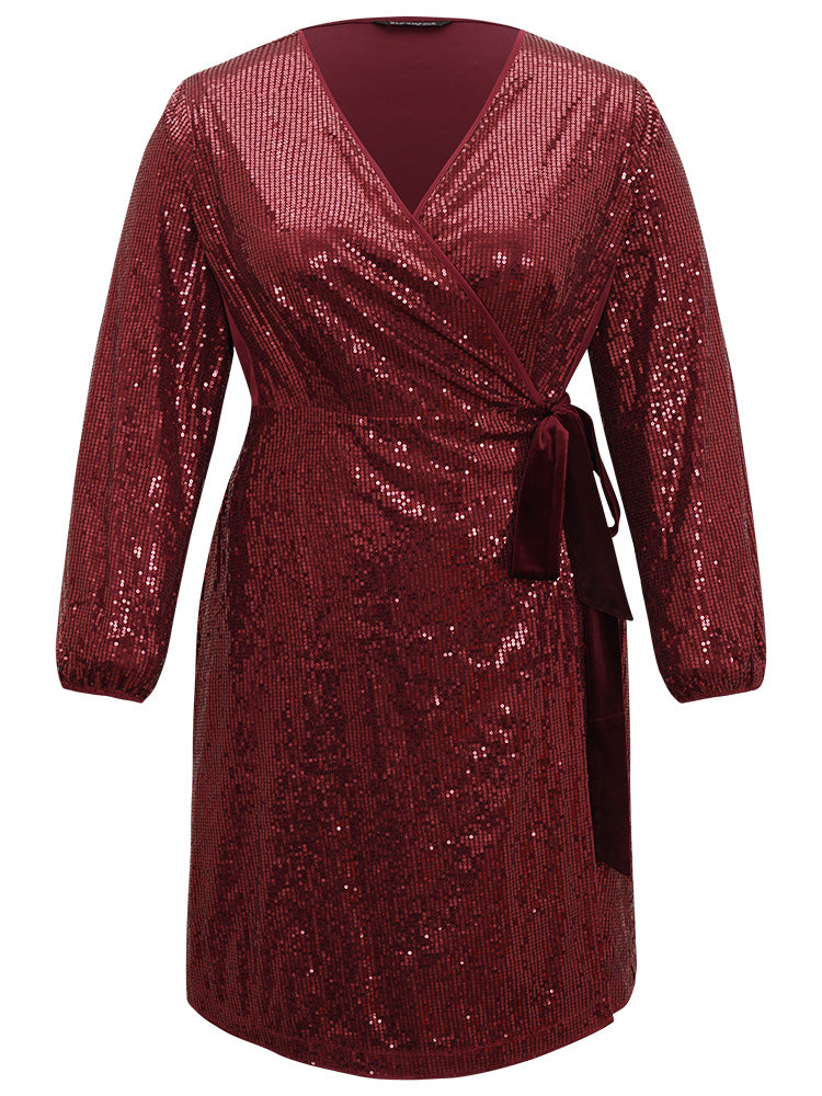 Shop Sequin Ties Side Surplice Neck Lantern Sleeve Dress now and redefine your style with confidence at Sweetccc. Tailored for mid and plus-size women. This trendy Dress. sizes 10-30. You can never go wrong with Sweetccc Dresses. Season:Winter;Color:Scarlet;Neckline:V-neck;Sleeve Type:Lantern Sleeve;Pattern Type:Plain;Details:Button. Plain. Elastic cuffs. Cross straps;Pocket:No-pocket;Belt:No-belt