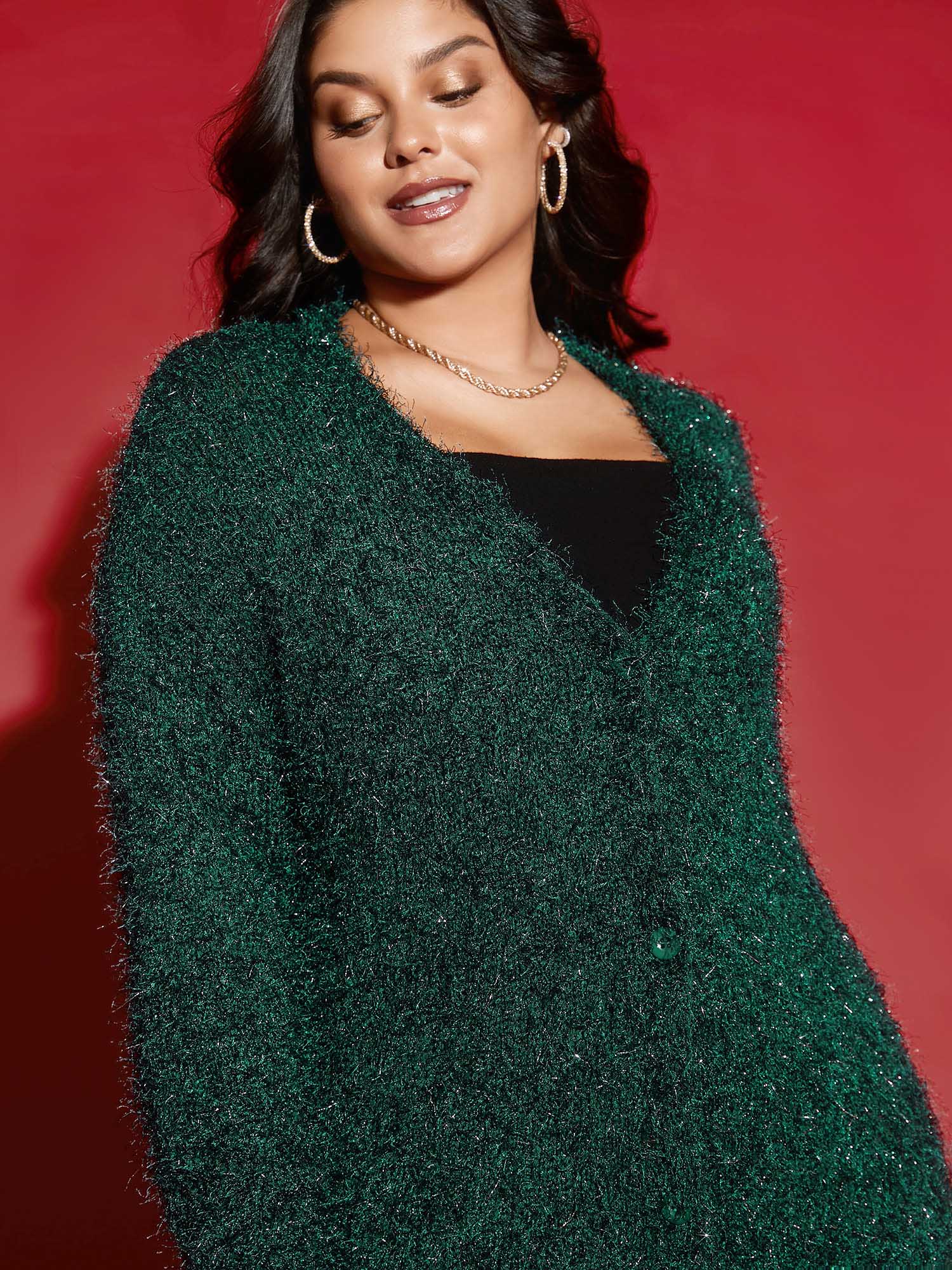 Shop Shimmery V-neck Button-Front Cardigan now and redefine your style with confidence at Sweetccc. Tailored for mid and plus-size women. This trendy Sweaters Cardigans Women. sizes 10-30. Season:Winter;Color:DarkGreen;Style:Cocktail;Neckline:V-neck;Sleeve Type:Drop shoulder sleeve;Prints:Non;Details:Button. Texture;Pocket:No-pocket;Belt:No-belt;Closure Type:Open front with closure