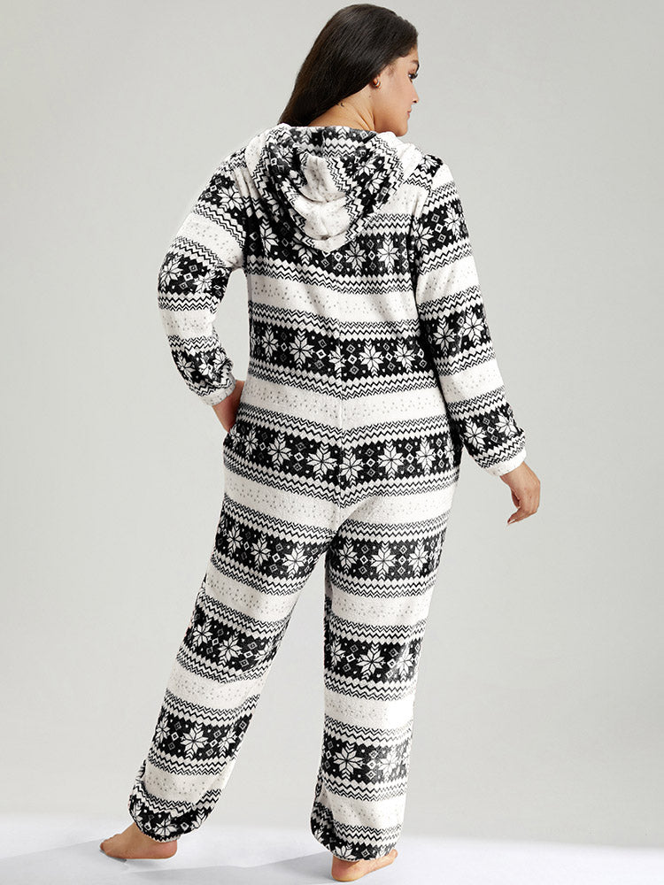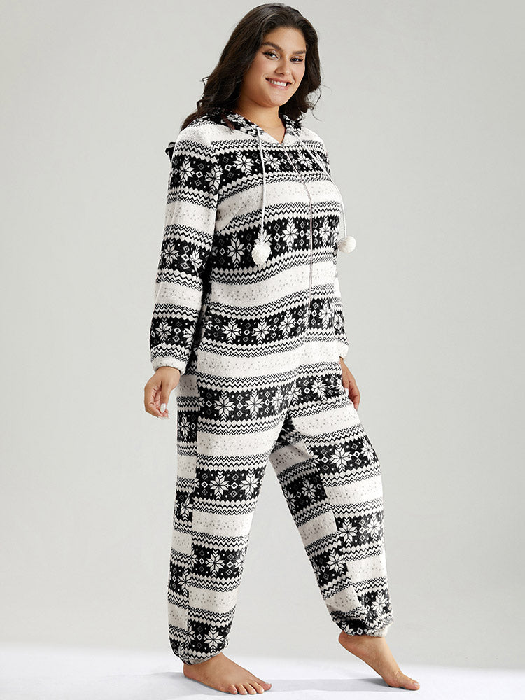 Shop Snowflake Print Fuzzy Trim Sleep Hooded Jumpsuit now and redefine your style with confidence at Sweetccc. Tailored for mid and plus-size women. This trendy Loungewear Women. sizes 10-30. Color:Black;Style:Casual;Neckline:Hooded;Sleeve Type:Regular Sleeve;Pattern Type:Graphic-Christmas;Details:Pocket. Zipper. Printed. Elastic cuffs;Pocket:It is perfectly sized to carry a phone.;Belt:No-belt