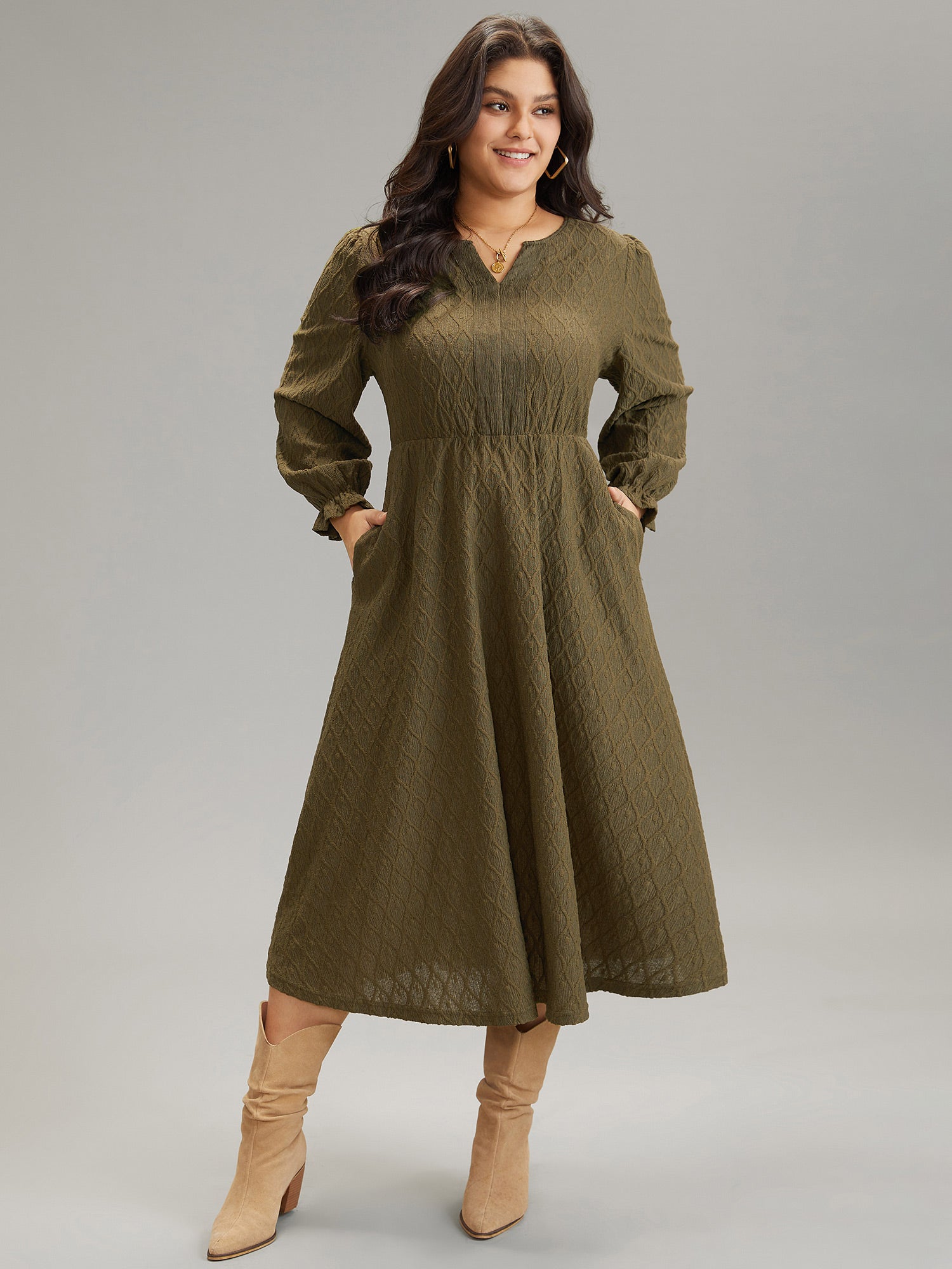Shop Textured Jacquard Notched Ruffle Sleeve Dress now and redefine your style with confidence at Sweetccc. Tailored for mid and plus-size women. This trendy Dress. sizes 10-30. You can never go wrong with Sweetccc Dresses. Color:ArmyGreen.DarkBrown;Neckline:Notched collar;Sleeve Type:Ruffle Sleeve;Pattern Type:Plain;Details:Pocket. Elastic Waist. Patchwork. Plain. Texture;Pocket:It is perfectly sized to carry a phone.;Belt:No-belt